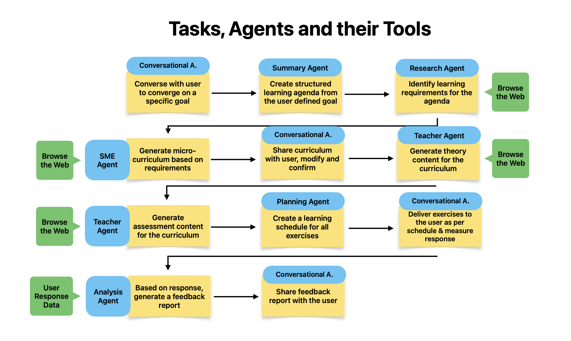 Following image displays the tasks, agent types and the tools for the tasks necessary for A Micro Learning Product